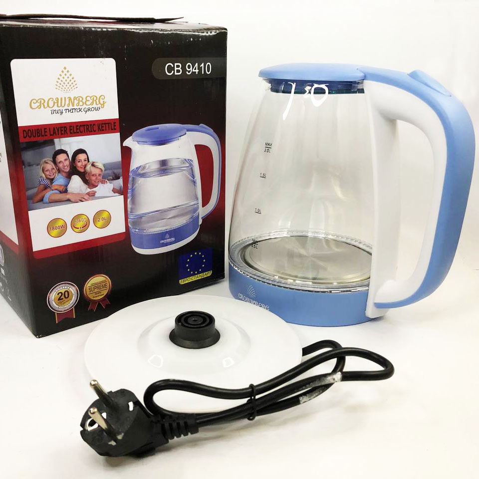 Електричний скляний чайник Crownberg CB-9410 має великий обсяг і буде просто незамінним у великій родині Це потужна модель, яка порадує вас швидкою роботою – він закип’ятить воду за лічені хвилини Простота в експлуатації та повна відповідність сьогоднішнім тенденціям у галузі кухонної побутової техніки