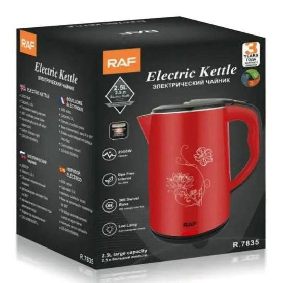 RAF R-7835 — компактний електричний чайник місткістю 2,5 літра та потужністю 2000 Вт обладнаний автоматичним вимкненням у разі закипання води Корпус виготовлений із високоміцної неіржавкої сталі, яка не зношується навіть після тривалої експлуатації електрочайника та має світлову індикацію під час кип'ятіння чайник обертається на підставці 360 градусів